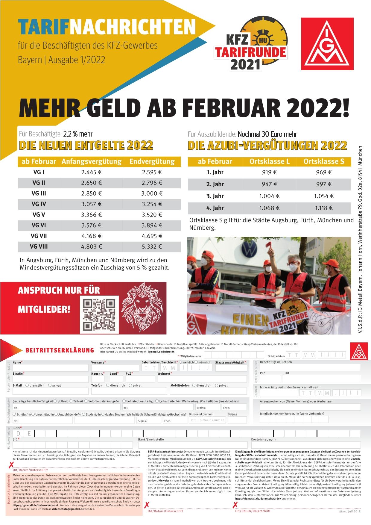 Im bayerischen KFZ-Handwerk steigen die Entgelte für die Beschäftigten in tarifgebundenen Autohäusern und Werkstätten im Februar 2022 um 2,2 Prozent. Die monatlichen Vergütungen für Auszubildende erhöhen sich nochmal um 30 Euro, nachdem sie bereits im August 2021 um 30 Euro gestiegen sind. Außerdem haben die Beschäftigten im August 2021 bereits 500 Euro netto als Corona-Beihilfe erhalten. Darauf hatten sich die IG Metall Bayern und der bayerische Arbeitgeberverband im Sommer 2021 in ihrem Tarifabschluss geeinigt, der bundesweit als Pilotabschluss übernommen wurde.