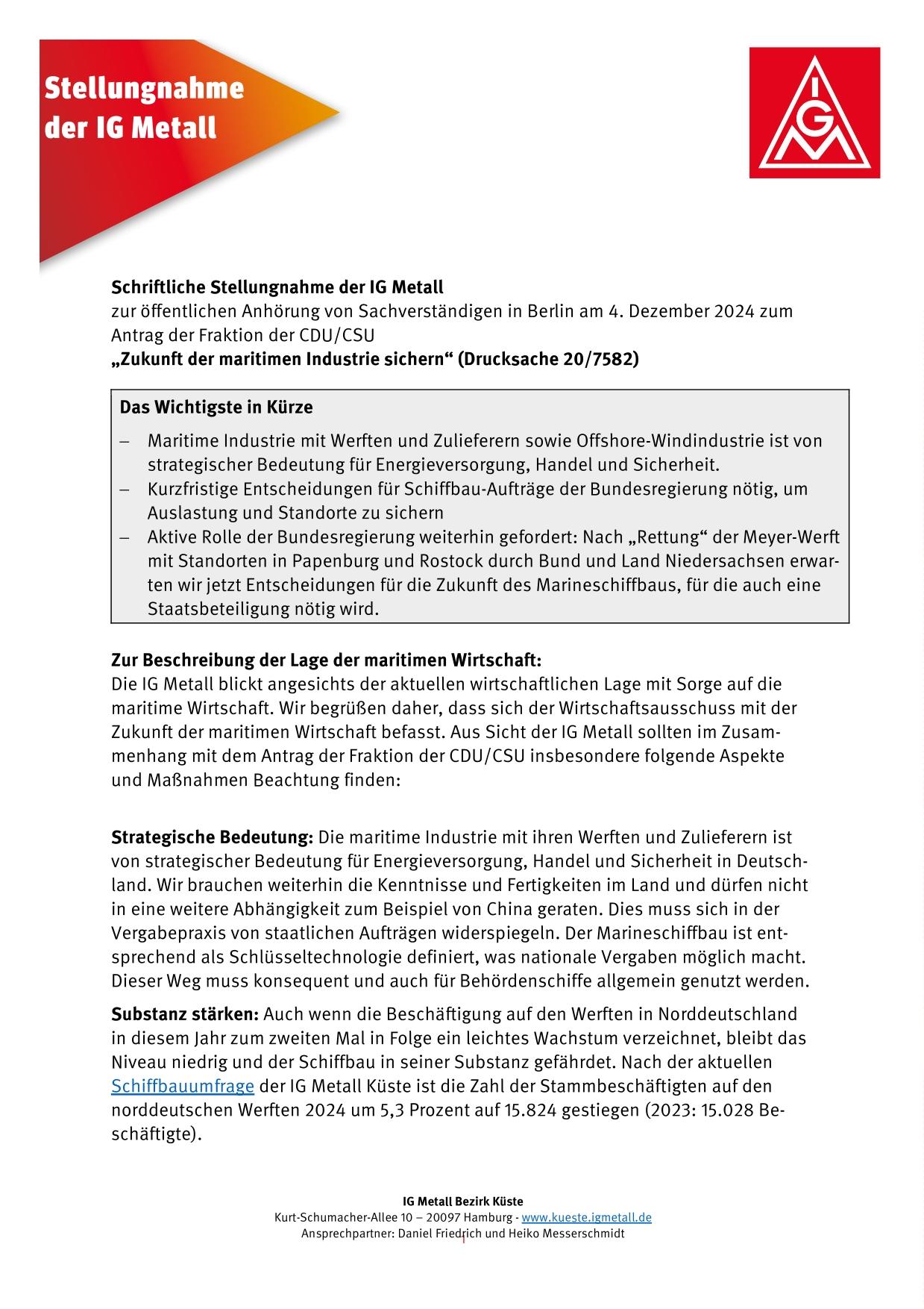 Die IG Metall Küste fordert kurzfristige Entscheidungen des Deutschen Bundestages, um die Auslastung und Standorte der Werften zu sichern. „Alle Fraktionen sind aufgerufen, auch nach dem Scheitern der Ampelkoalition über die anstehenden Aufträge für die Marine wie weitere U-Boote und für Behördenschiffe wie Bundespolizeiboote und das Forschungsschiff Polarstern II zu entscheiden“, sagte Daniel Friedrich, Bezirksleiter der IG Metall Küste, nachdem die Verschiebung von Entscheidungen im Haushaltsausschuss bekannt geworden ist. Ursprünglich war geplant, in dieser Woche unter anderem über den Lieferauftrag von vier U-Booten der Klasse U212CD zu entscheiden.