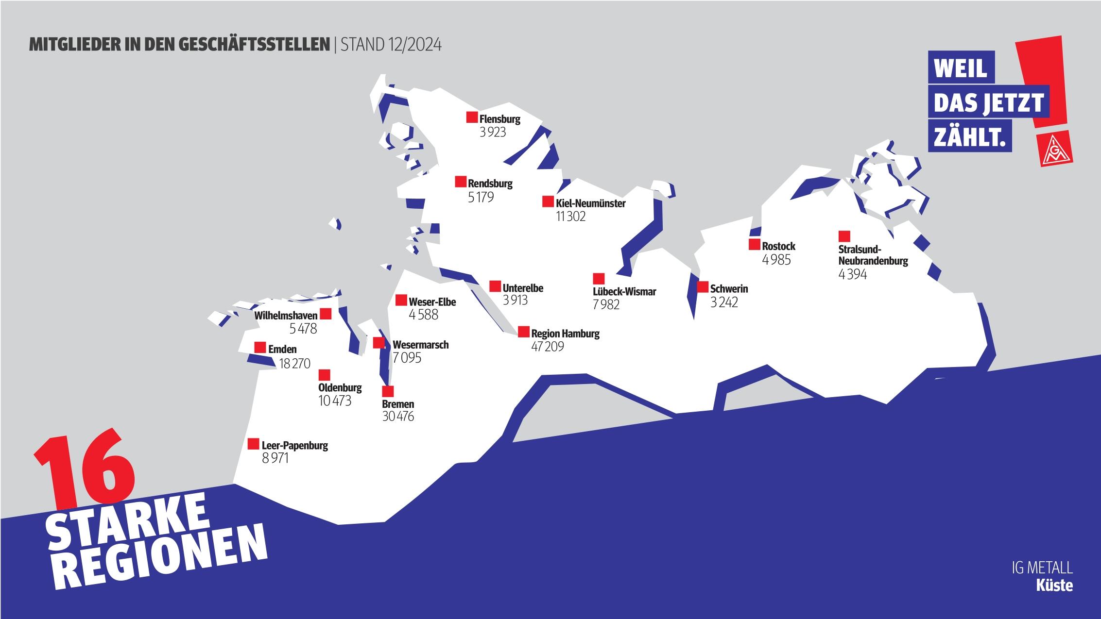 Das sind rund 171.735 Mitglieder [siehe PDF-Dokument - unten] in Schleswig-Holstein, Mecklenburg-Vorpommern, Hamburg, Bremen und dem nordwestlichen Niedersachsen. Wir vertreten die Interessen der Beschäftigten aus den Bereichen Metall- und Elektroindustrie, Handwerk, Kontraktlogistik, Textil und Bekleidung sowie Holz und Kunststoff.